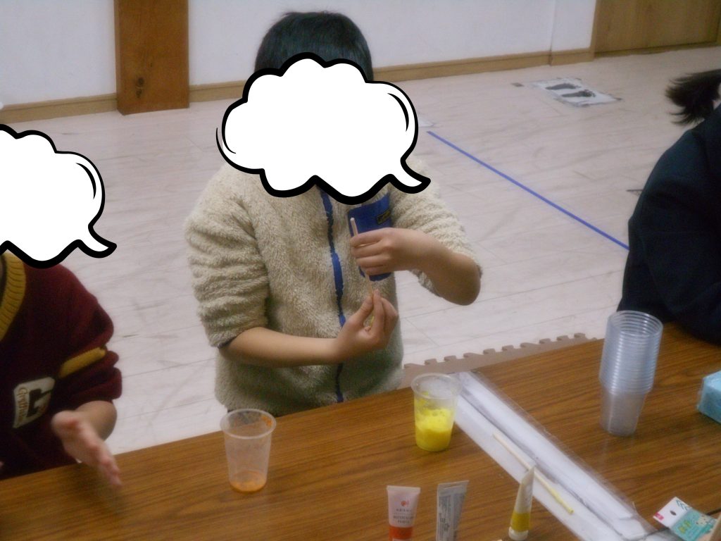 まずは洗濯のりに色を付けました。それぞれ好きな色を入れたり、どんな色ができるかを想像しながら色を混ぜる子もいました。