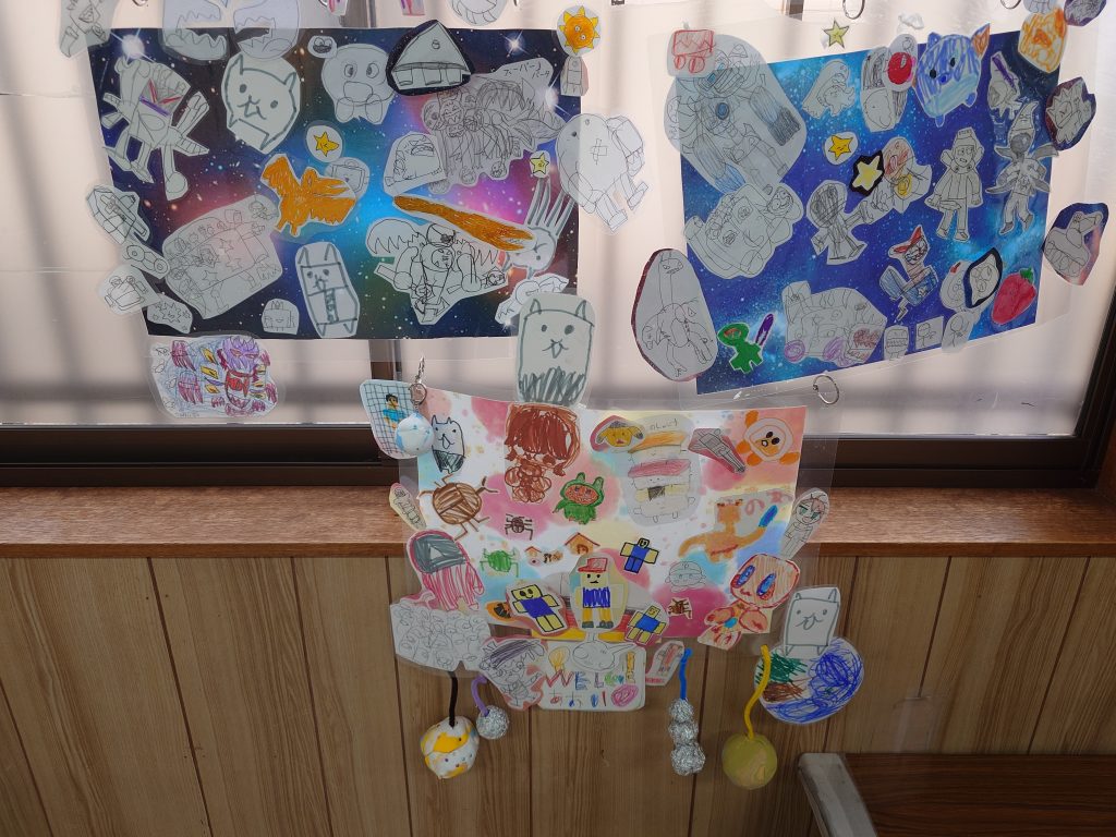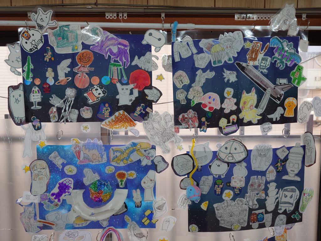 それぞれ子ども達が絵を描いて紙に貼り付け、粘土で惑星の形を作りました。